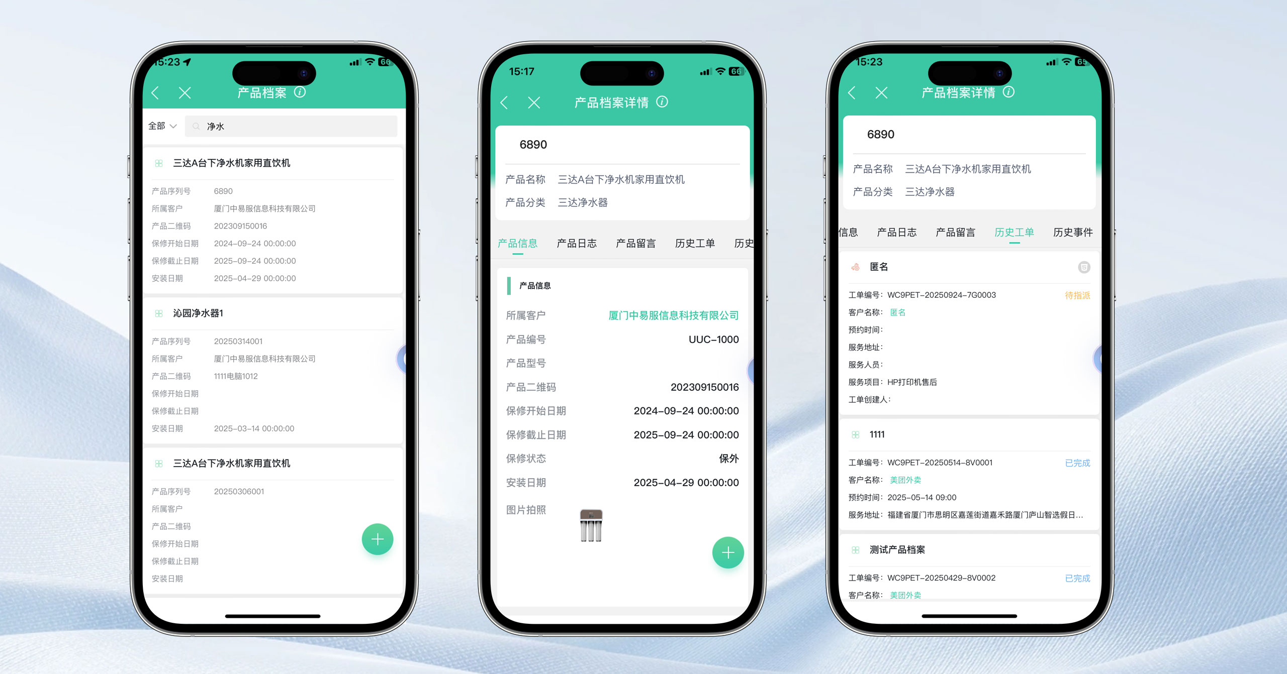 其实,解决 “设备档案混乱” 的问题,只需要「单小二净水设备售后管理软件」!这款软件专为净水行业设计,客户安装设备时,员工用手机就能录入设备型号、序列号、安装地址、购买时间、滤芯规格、保内保外等信息,还能上传设备照片、合同文件,所有档案都储存在云端,不怕丢失;后续不管是维修、换滤芯,还是保养,只要输入客户手机号或设备编号,就能一键调出完整档案,师傅再也不用 “猜型号”,客户也能清晰看到服务记录,专业度瞬间拉满。